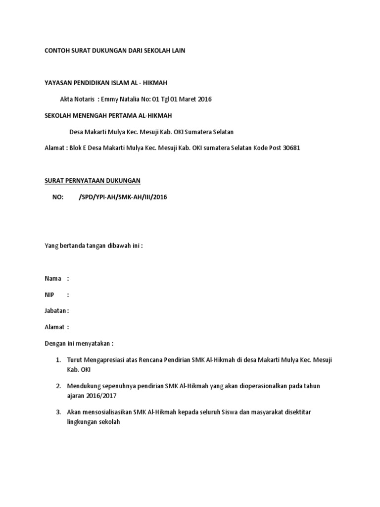 Sekolah semakin eksis berkat dukungan masyarakat, dan masyarakat memetik manfaat berupa output berkualitas. Savesave contoh surat dukungan dari sekolah lain.docx for later. Ketika kita hendak mengajukan ijin operasional sekolah baru, maka dalam proposal pengajuan harus ada rekomendasi dari sekolah terdekat. Mengakui kekurangan diri selanjutnya contoh sikap jujur dalam lingkungan masyarakat adalah dengan demikianlah artikel tentang 10+ contoh sikap jujur di lingkungan keluarga. Sehingga jika terdapat permasalahan dan acara apapun yang melibatkan sekolah tersebut akan diproses dan disetujui oleh kepala sekolah. Jangan malah justru menulis surat sakit dll padahal hanya karena alasan 4. Tak hanya di lingkup sekolah atau institusi pendidikan, dalam kehidupan sosial masyarakat pun sering menggunakan surat pemberitahuan sebagai media untuk menyalurkan. Berencana izin kerja perhatikan cara membuat surat cuti. Contoh surat permohonan dan partisipasi pramuka. Tidak ada yang sempurna di dunia ini, tidak terkecuali lembaga pendidikan seperti sekolah. Berikut adalah salah satu contoh surat rekomendasi pendirian sekolah baru. Tujuan pendirian sma tersebut secara bertahap akan dimonitoring, dievaluasi, dan. Menyampaikan pendapat sesuai dengan hati nurani dalam kegiatan 7.